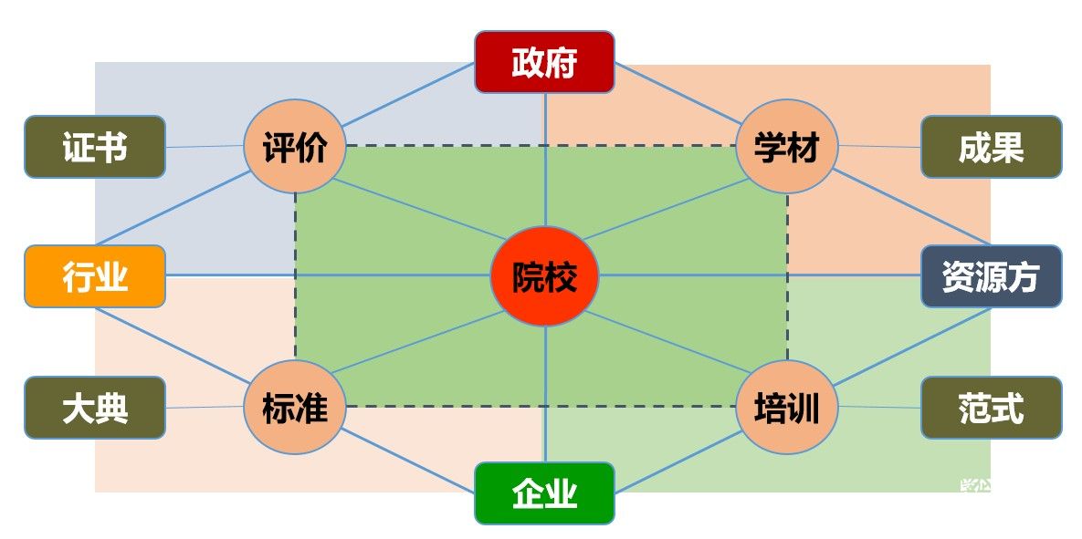 我們認為產(chǎn)教融合的關鍵痛點是如何貫通標準、學材、培訓、評價四個方面(也就是圖中虛線部分),使得學生可以在院校里有相對貫通的標準引領、學材資源、培訓組織、評價認證所保障的學習經(jīng)歷。
