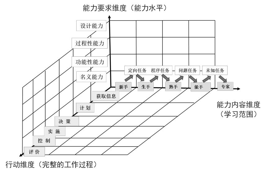 ?內容維度:包括“職業定向性的任務”、“程序化的任務”、“蘊含問題的特殊任務” 和“不可預見的未知任務”四個職業工作范圍,對應四個學習范圍,即“定向和 概括性知識”、“關聯性知識”、“具體與功能性知識”和“學科系統化的深入知識”。