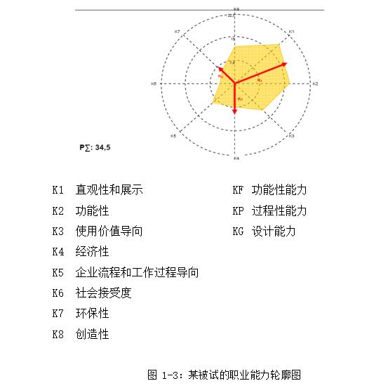 為了解釋和評價被試提供的任務解決方案,我們建立了針對 4 個能力級別的由 8 個 力指標(見圖 1-2)組成的指標體系,這 8 個指標分別是:“直觀性/展示”、“功能性”、“使 用價值導向”、“經濟性”、“企業生產流程和工作過程導向”、”社會接受度”、”環保性”和 “創造性”。