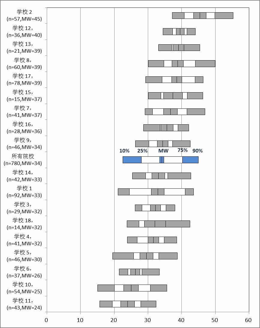 呈現給學校的測評結果:通過測評,學校可以了解到自己在所有參加測評的職業院校中的人才培養水平(見 圖 1-4),了解自己學生的職業能力總體狀況(見圖 1-5),了解不同班級學生職業能力水 平的差異和課程改革的效果(見圖 1-6)。