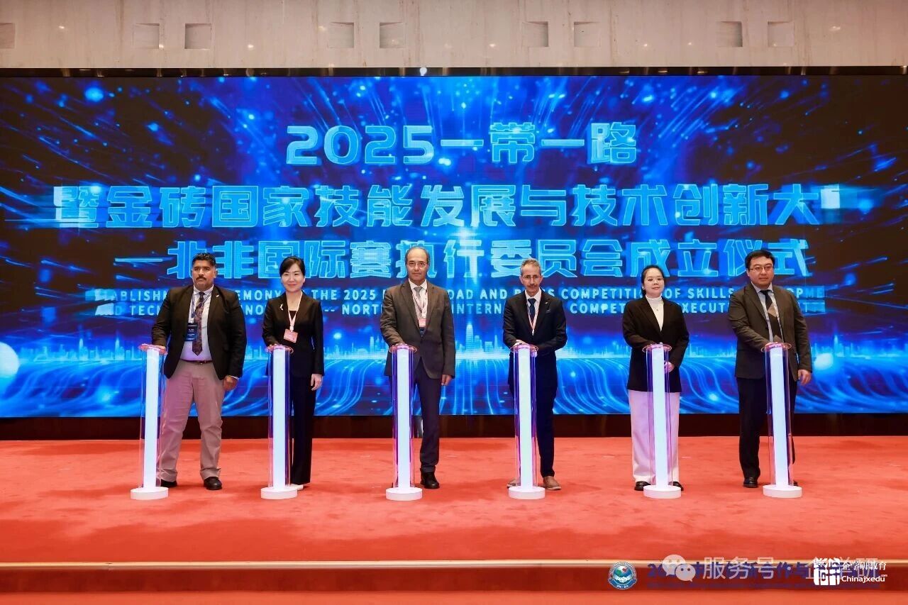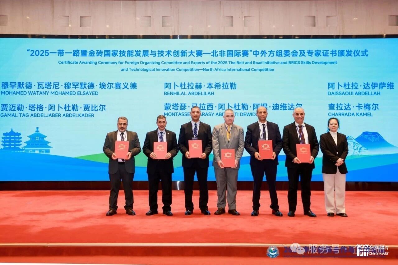 2025年11月22日,“2025一帶一路暨金磚國(guó)家技能發(fā)展與技術(shù)創(chuàng)新大賽—北非國(guó)際賽執(zhí)行委員會(huì)成立儀式”和“中外方組委會(huì)暨專家證書頒發(fā)儀式”在武漢中非教育合作創(chuàng)新發(fā)展論壇上舉行。中北非國(guó)際教育創(chuàng)新聯(lián)盟副主席巴爾卡維、摩洛哥中北非國(guó)際教育創(chuàng)新聯(lián)盟副主席馬祖茲、突尼斯中北非國(guó)際教育創(chuàng)新聯(lián)盟副主席凱斯、中北非國(guó)際教育創(chuàng)新聯(lián)盟秘書長(zhǎng)陳璐、廈門市金磚未來(lái)技能發(fā)展與技術(shù)創(chuàng)新研究院的國(guó)際部部長(zhǎng)朱秀青、北京企學(xué)研教育科技研究院副院長(zhǎng)李昂共同參加“2025一帶一路暨金磚國(guó)家技能發(fā)展與技術(shù)創(chuàng)新大賽—北非國(guó)際賽執(zhí)行委員會(huì)成立儀式”。