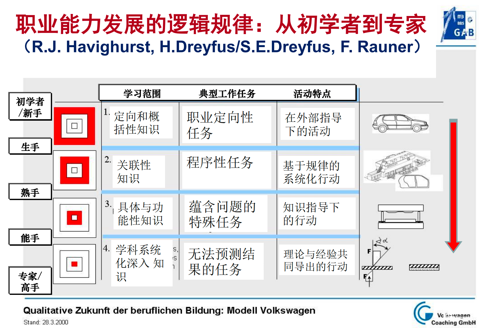 COMET職業能力模型建立在一系列現代職業教育的理論基礎之上。如情境學習和行動導向的學習理論、多元智能和發展性任務的心理學理論、設計導向的職業教育指導思想、從“初學者到專家”(from novice to expert)職業成長邏輯規律的專家智能理論以及工作過程知識的工業社會學理論等。