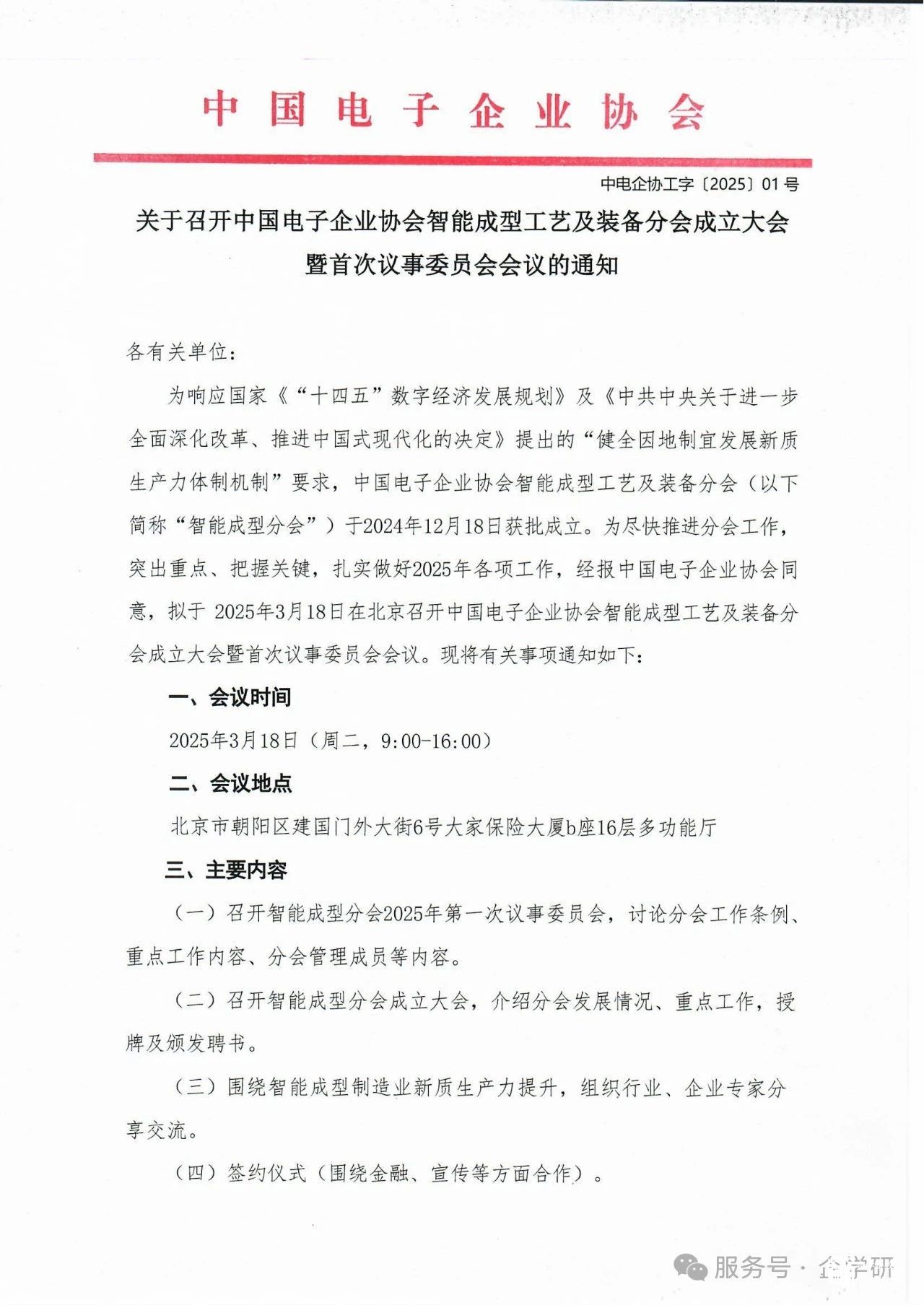 關于召開中國電子企業協會智能成型工藝及裝備分會成立大會的通知