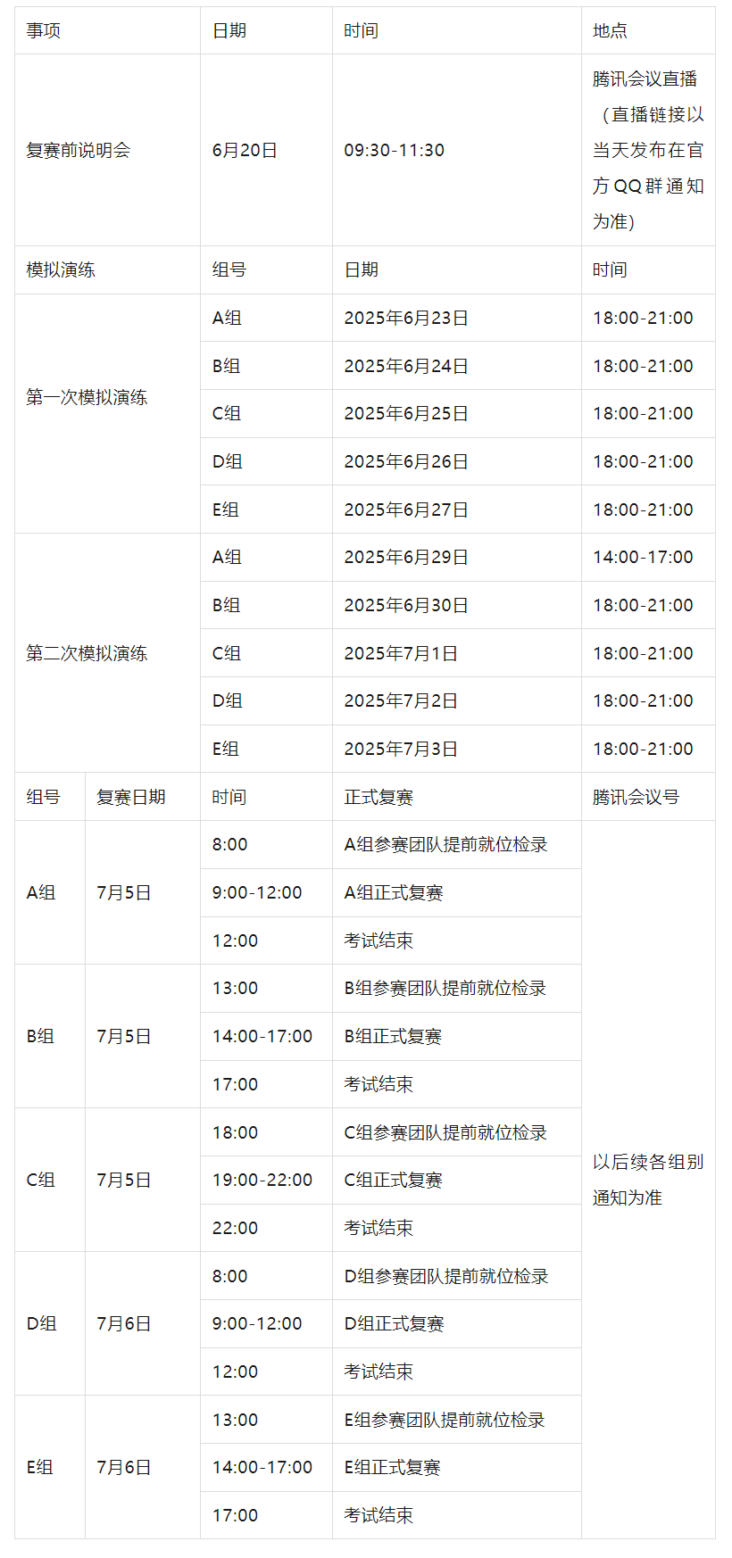 (二)復賽時間:2025年7月5日-6日。復賽隊伍將按照隨機分組的方式共分為5組(分組情況將在復賽賽前說明會上進行),5個組別分別對應5個競賽時間段,每組比賽時長為3小時。