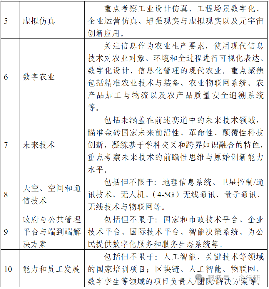 技術創新賽以“技術創新引領金磚國家新工業發展”為主題,設置先進制造,數字醫療,綠色能源,人工智能,虛擬仿真,數字農業,未來技術,天空、空間和通信技術,政府與公共管理平臺與端到端解決方案,能力和員工發展十大賽道。
