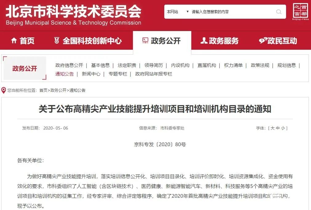 2020年5月11日,北京市經濟和信息化局《關于發布北京市高精尖產業技能提升培訓機構和第二批培訓項目目錄的通告》。